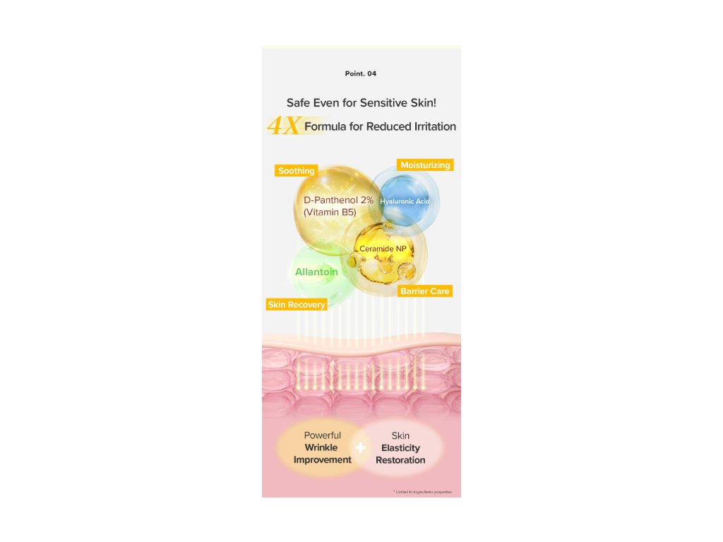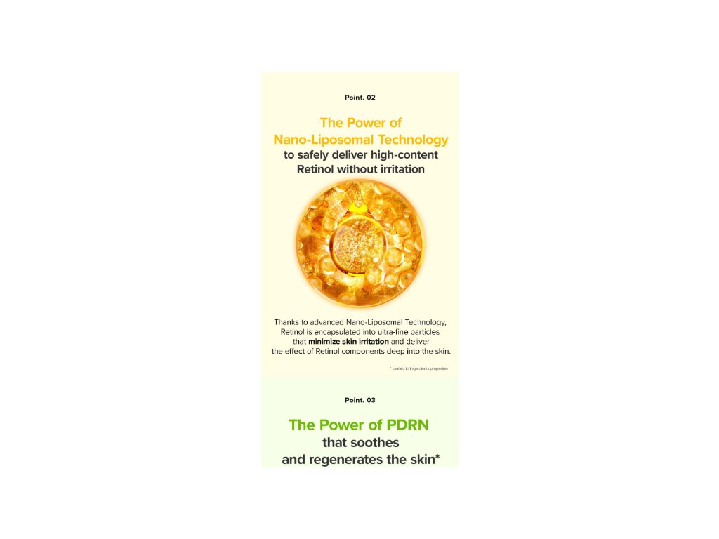 Retinol je složka používaná v kosmetice proti známkám stárnutí, zaměřená na obnovu pleti a zjemnění vrásek. PDRN (Sodium DNA) je využíváno v péči o pleť se zaměřením na regenerovaný a pevnější vzhled.