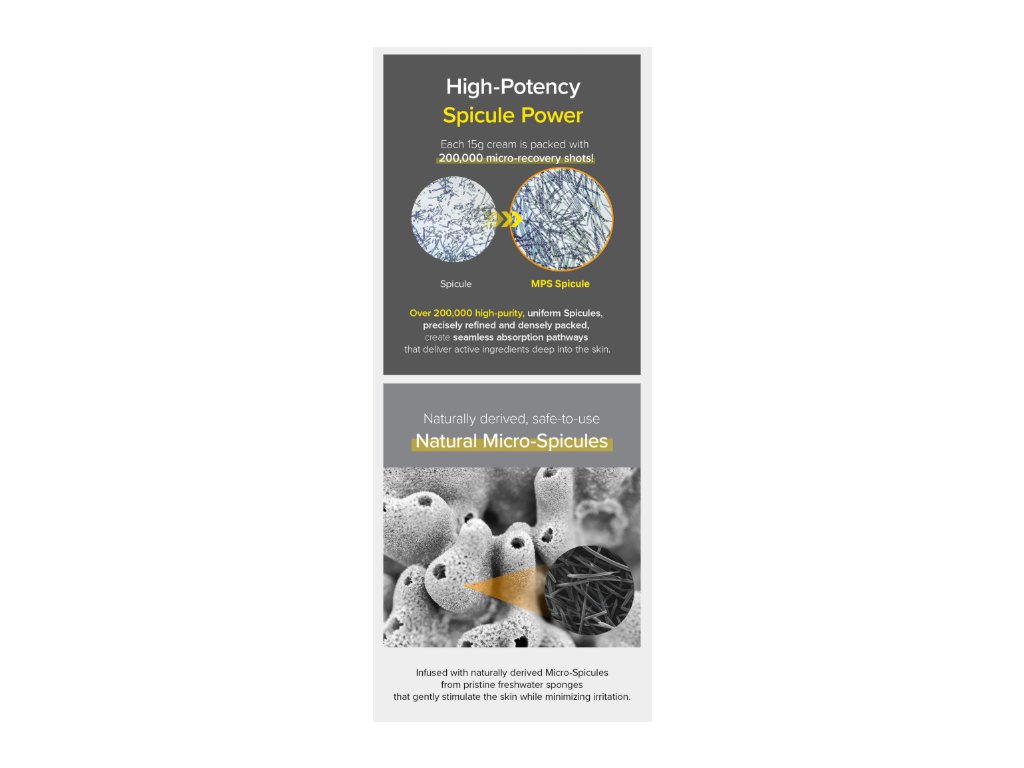 Základem tohoto krému je Hydrolyzed Sponge (spicule) – mikroskopické jehličky přírodního původu, které při aplikaci jemně stimulují pleť. Tento efekt podporuje lepší vstřebávání aktivních látek a celkový regenerační účinek krému.