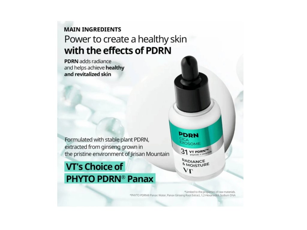 VT Cosmetics 31 PDRN cica exozome Radiance and Moisture – Hydratační rozjasňující ampule s PDRN 30 ml R2 zpevňující ampule s ceramidy a peptidy